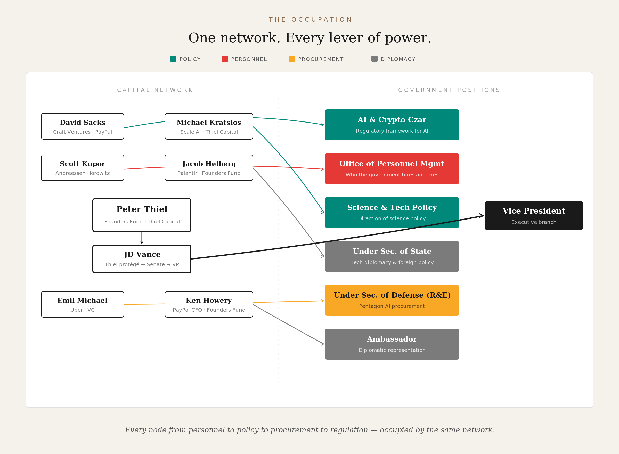 Notice what these positions control. OPM governs the civil service. OSTP shapes science policy. The Under Secretary of War controls defense technology procurement. The AI Czar sets the regulatory framework for the technologies his fund invests in. Every node in the chain from personnel to policy to procurement to regulation is occupied by someone from the same capital network. This is not influence. It is operation.